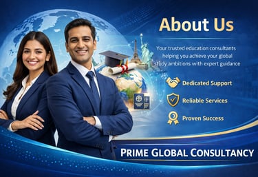 Prime Global Consultancy is a professional consultancy firm dedicated to assisting students and professionals with international education and work permit opportunities. We provide end-to-end support from profile assessment and document preparation to application submission and post-arrival guidanceensuring a transparent, compliant, and client-centric process. Our mission is to simplify complex procedures and help our clients make informed decisions with confidence.